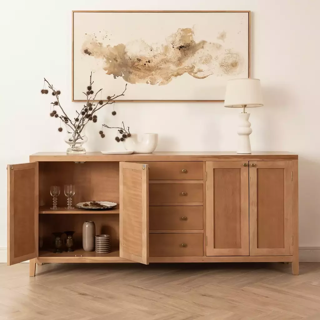 Elegancia y funcionalidad se encuentran en el Aparador Creta. Fabricado en estructuras macizas de Lenga proveniente de Tierra del Fuego, este mueble destaca por su calidad, calidez natural y diseño atemporal. Con cuatro cajones centrales y dos espacios laterales con puertas, ofrece una solución ideal para almacenar y organizar vajilla, mantelería o elementos decorativos.